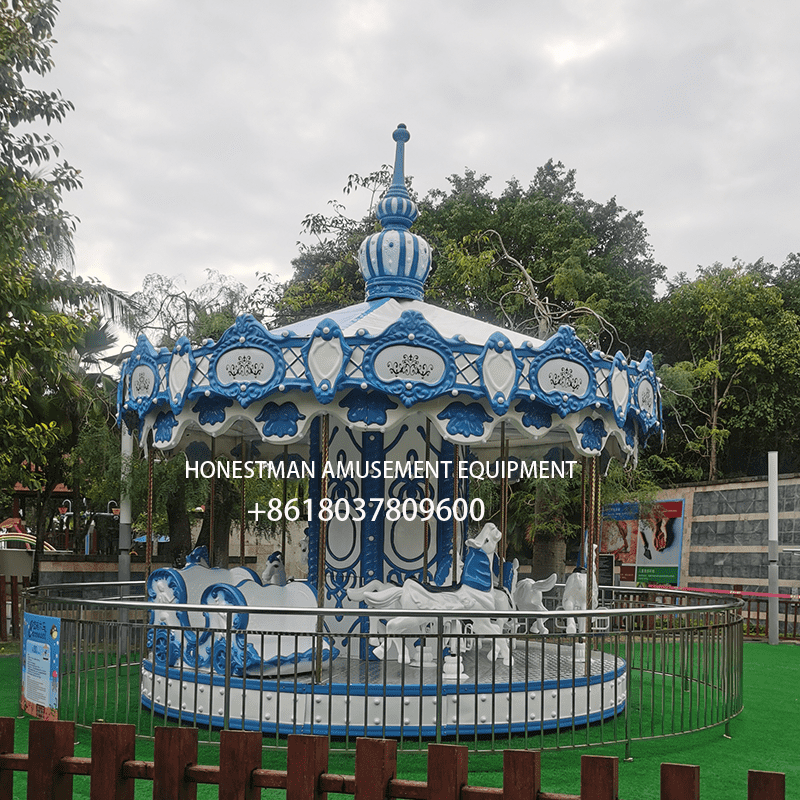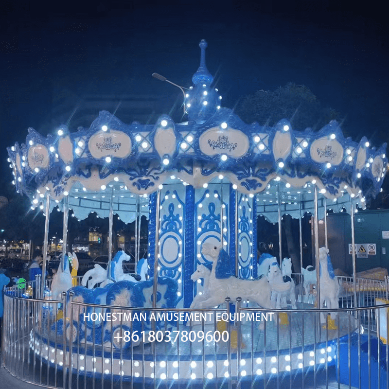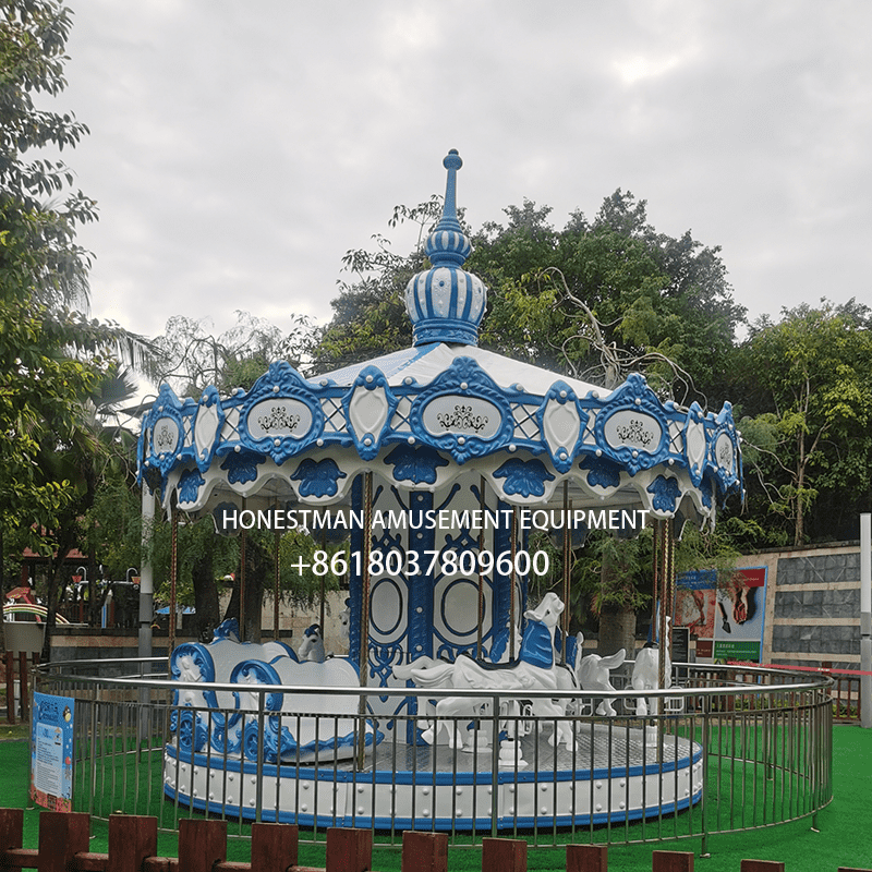 This extremely classic carousel has a simple blue and white color combination, resembling blue and white clouds. It is particularly suitable for installation on lawns. This classic design is the most widely used and can be produced in 6-seates, 8-seates, 10-seates, 12-seates, 16-seates, 24-seates and 36-seates versions.