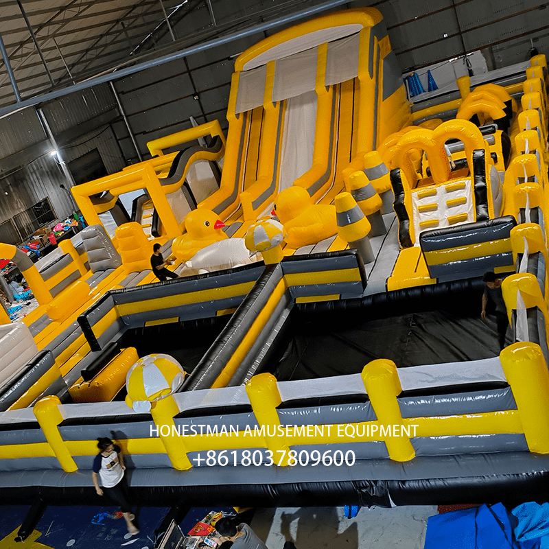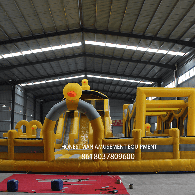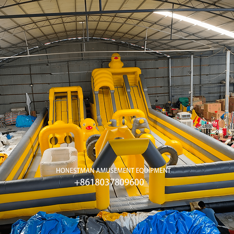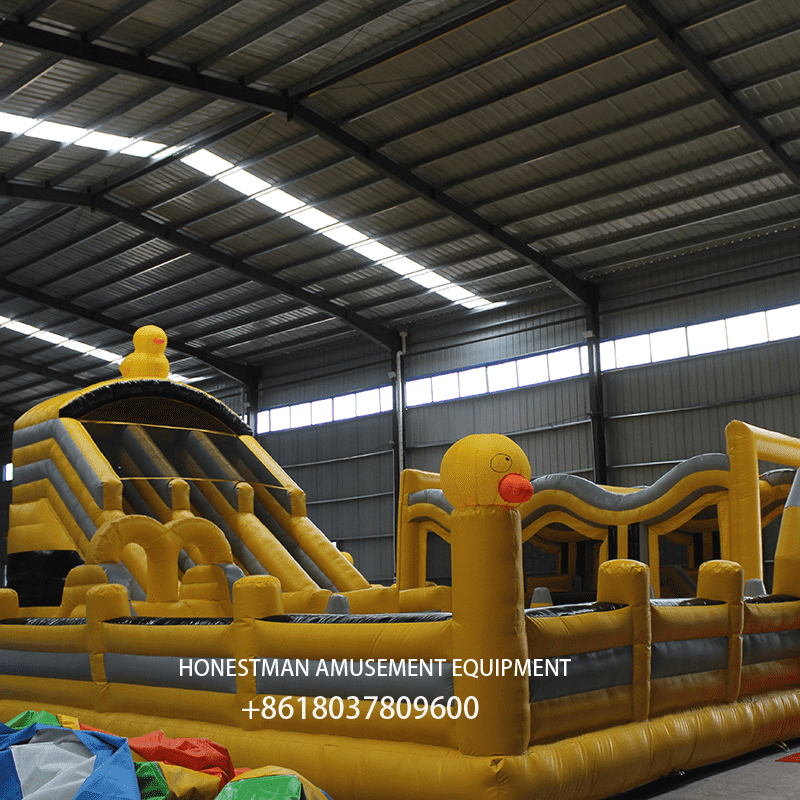 This bouncy castle with slide features a yellow duck theme. It’s all yellow and comes with slides, houses, and other designs. Custom sizes, colors, themes, and even blower voltage are available.