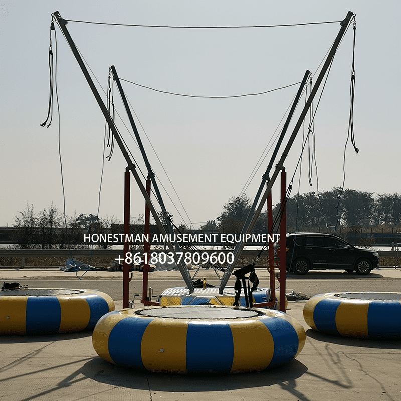 This Bungee Trampoline is more thrilling and suitable for those aged 12 and up. It can accommodate up to four people at a time, offering a high bounce height for a thrilling experience. The structure is constructed of galvanized steel pipes, with elastic cords suspended from it. The base is a square or rectangular trampoline. An electric hoist lifts the user, and gravity triggers the bounce. The greater the weight, the greater the bounce.