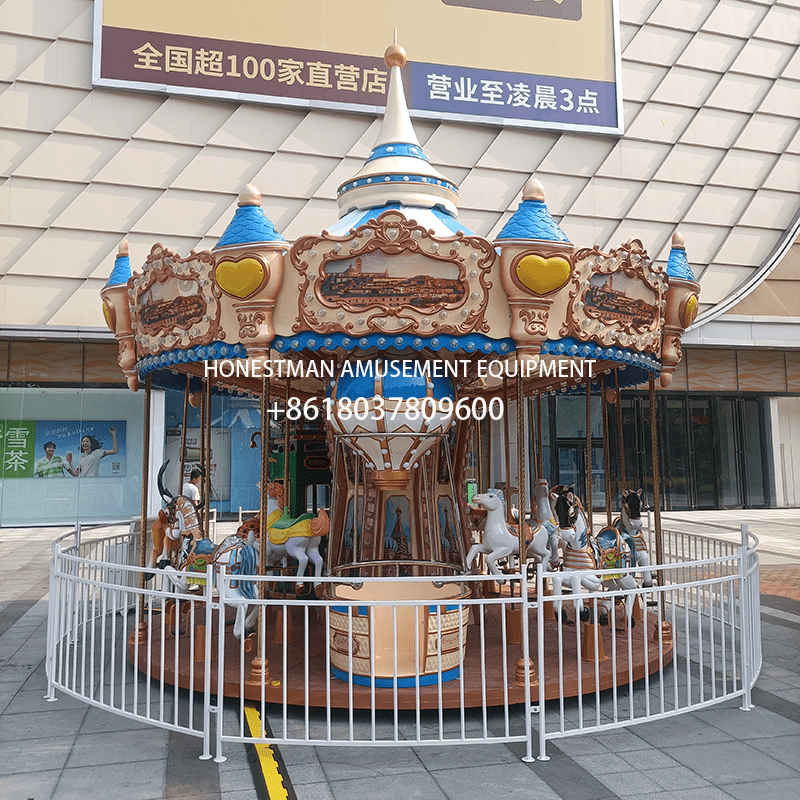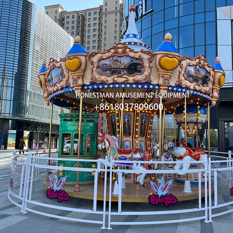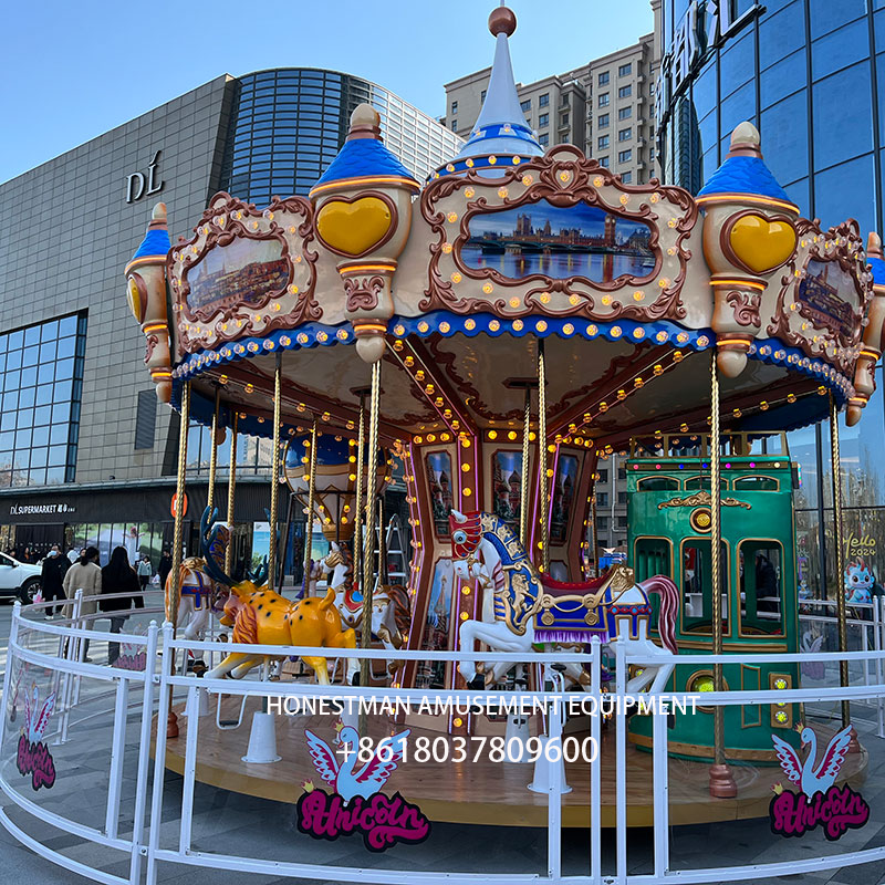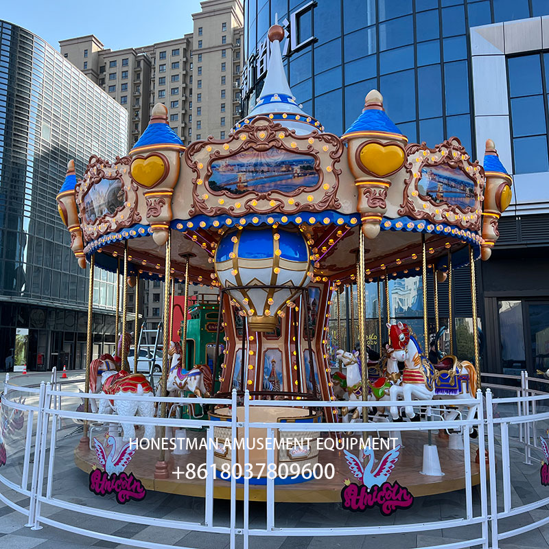The materials of this children’s and adult carousel are fiberglass reinforced plastic and steel. The top is equipped with a PVC waterproof tent, the ceiling is made of fiberglass, the round disc is covered with wooden flooring. Some of the horse shapes have been replaced by bus-like designs. The hot air balloon cabin is convenient for babies to ride, and there are also deer with horns on their heads. The selected fences are made of steel pipes and PVC boards.