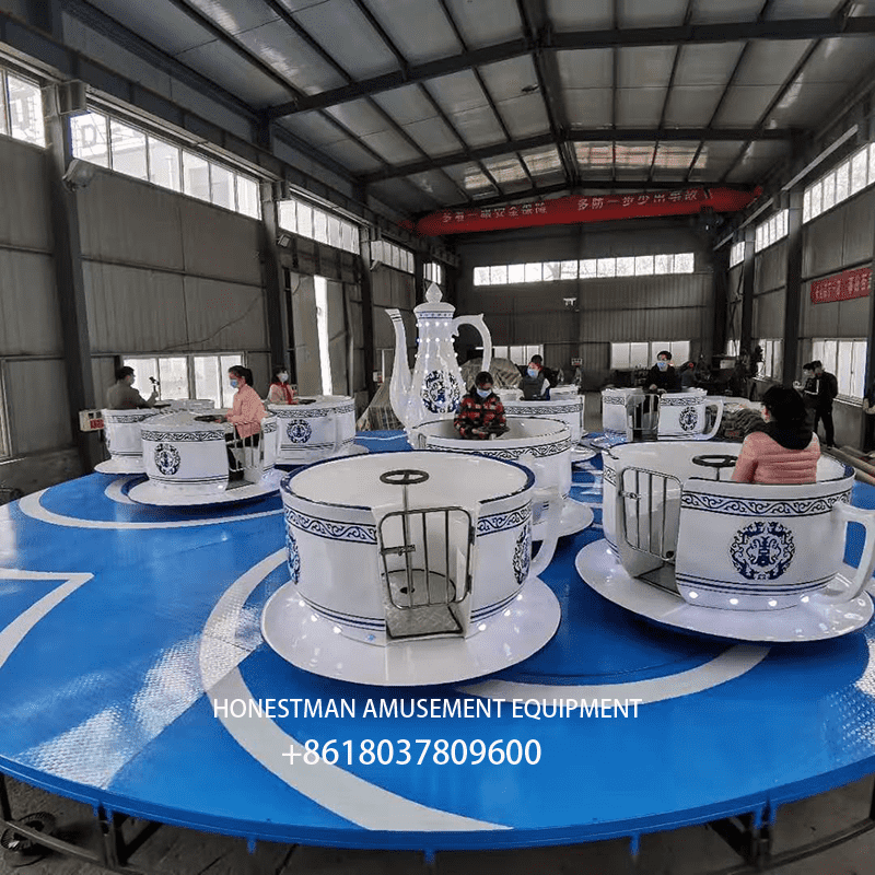This coffee cup amusement park very interesting device that can be used indoors or outdoors and is very safe. It comes in sets of three cups, and as the disc rotates, the smaller cups also rotate. The theme is a coffee pot and a coffee cup. If needed, you can dig a hole in the ground so that the platform is parallel to the ground for a more aesthetically pleasing effect.