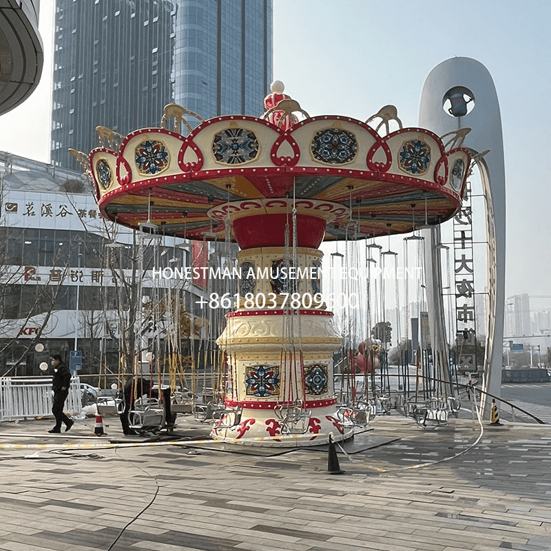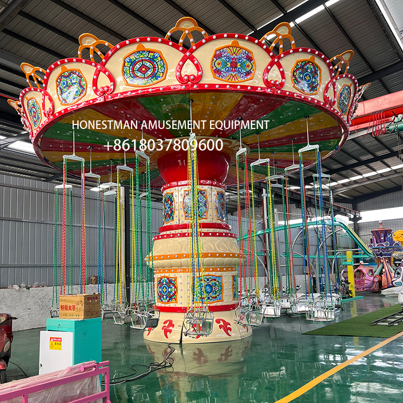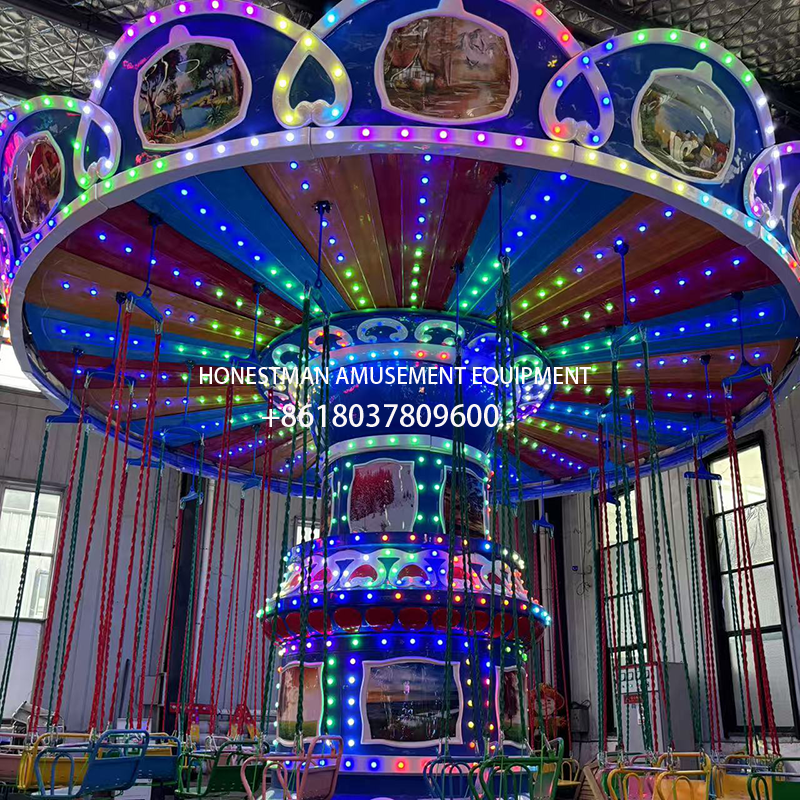 The Flying Chair Amusement Park is perfect for parks, scenic spots, amusement parks, resorts, and more. This 24-seat model features a lift and swing function, creating a thrilling ride. The aircraft-style design is made of fiberglass, creating a beautiful design with LED color-changing lights. The ceiling is constructed of durable aluminum-plastic panels. Three motors provide lift, rotation, and swing functions.