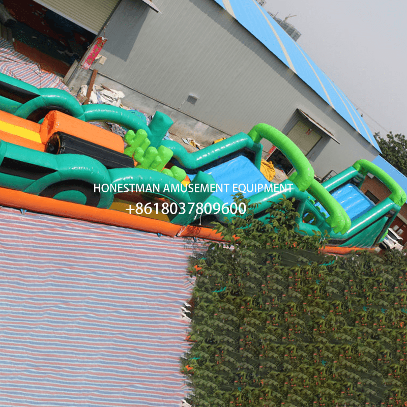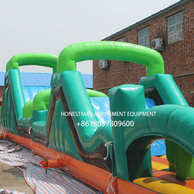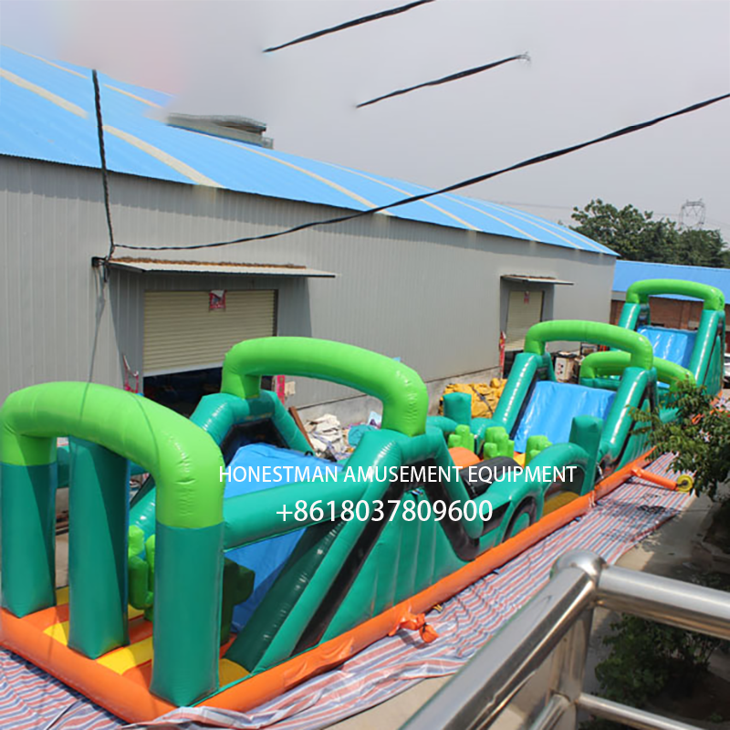This is inflatable obstacle course for kids. The main color is green, with 5 obstacles, just like 5 big mountains, winding up and sliding down.