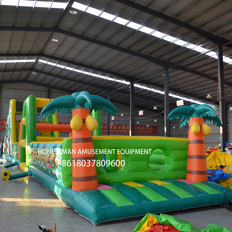 The inflatable obstacle course with a coconut tree theme is really fun.