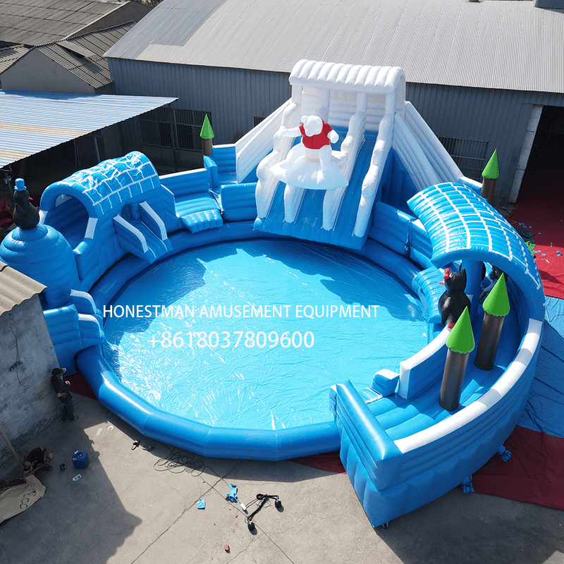 The Ice and Snow Kingdom inflatable slide water park features igloos, snowy mountains, penguins, and other elements. It has a circular pool in the center, with an inflatable slide surrounding half of the pool. Children can slide directly from the inflatable slide into the pool, making it a perfect and classic children’s water park experience.