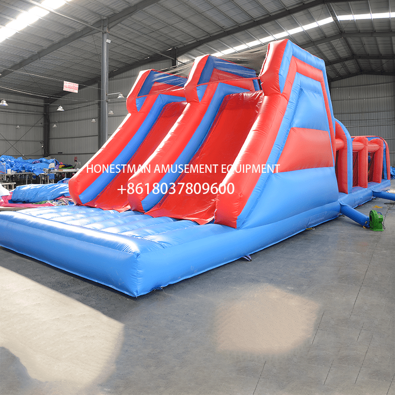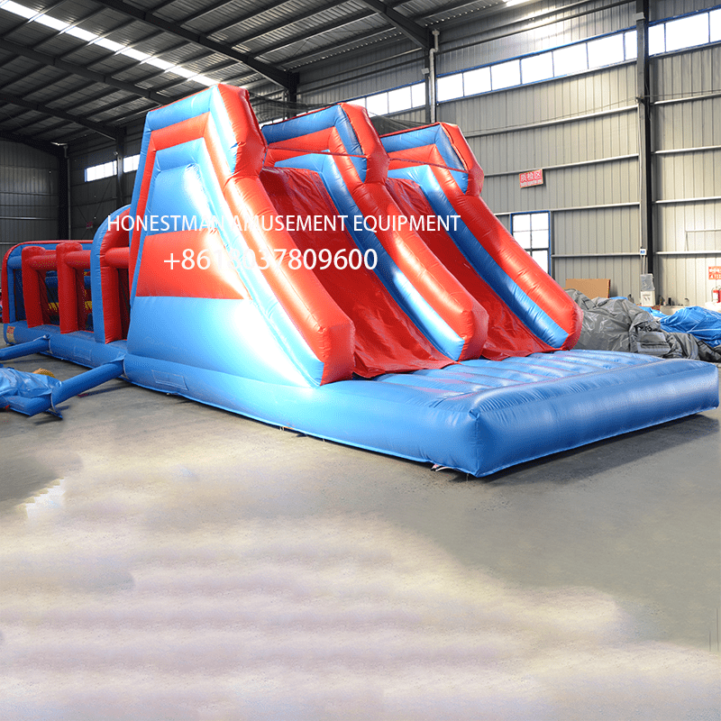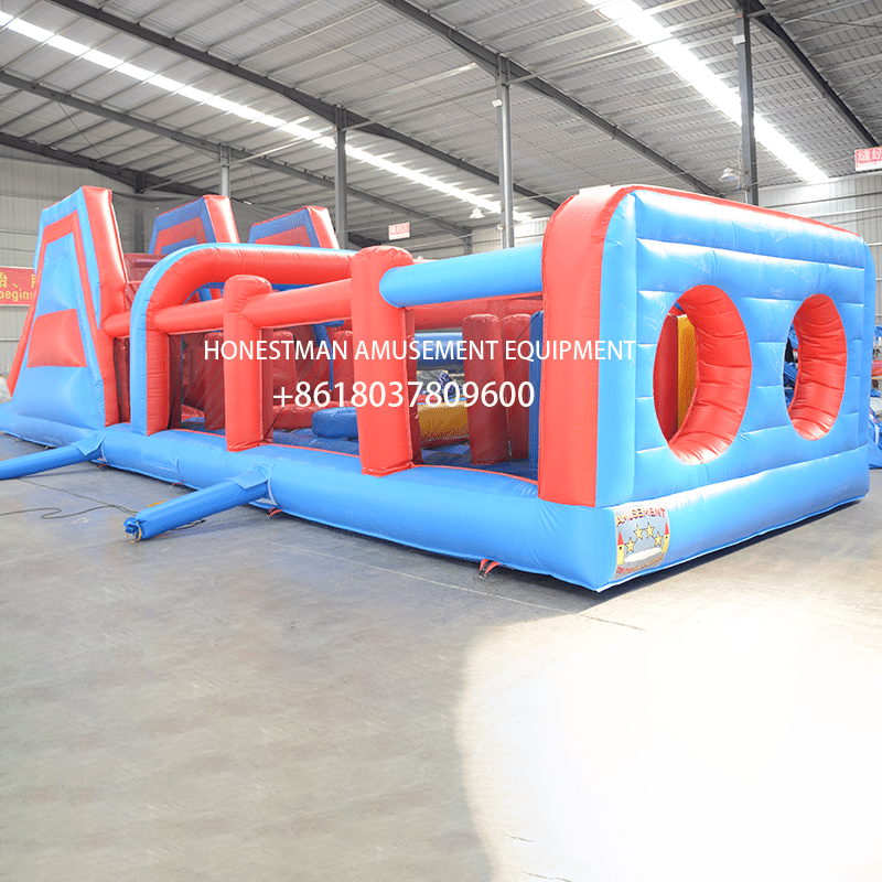 The way to play this obstacle course bounce house is to drill into the house, pass through the building blocks, then jump through hoops, building blocks, ladders, and slides. You can also play it in reverse.