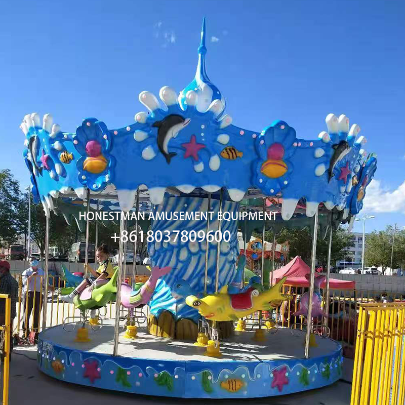 The Ocean Carousel is suitable for seaside amusement parks and aquariums. Its cornice features mermaid motifs, while the centerpiece features waves and starfish. The wooden horses are shaped like marine animals, including dolphins, lobsters, crabs, and seahorses. The fiberglass base features waves and seaweed. Due to the large centerpiece, this carousel can only 16 seats .