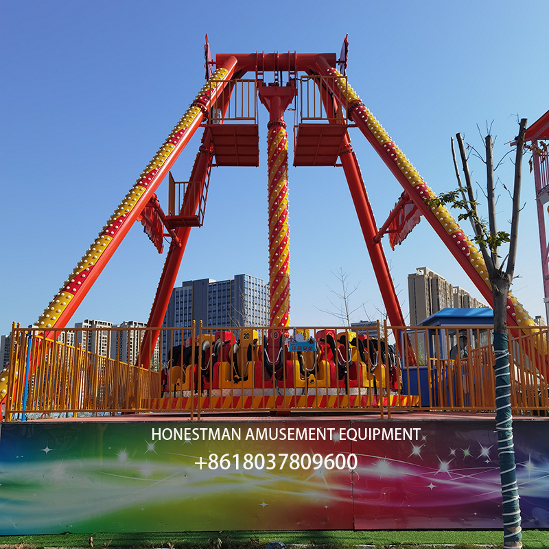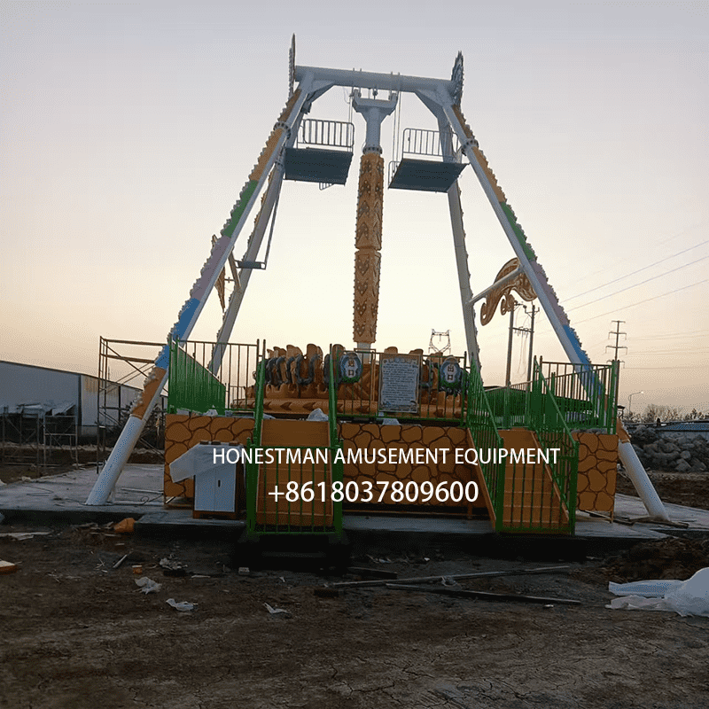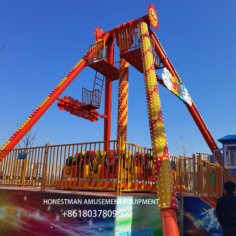 In the Pendulum Ride Amusement Park, guests sit on seats. Two (or more) motors on top of the device drive the “pendulum” to swing horizontally, while the motors simultaneously rotate the large turntable of the seat. As they swing and drop at breakneck speeds, they experience thrills and excitement, seeking a new kind of pleasure amidst their hectic schedules.