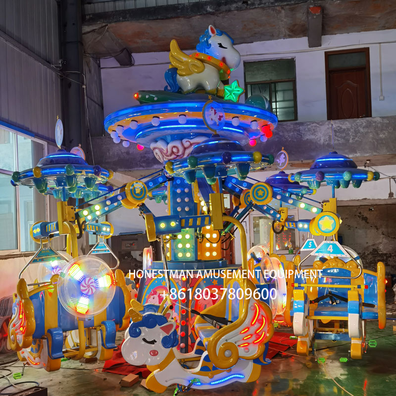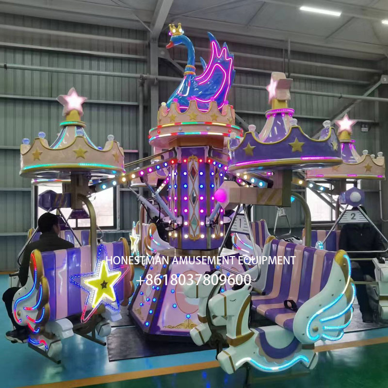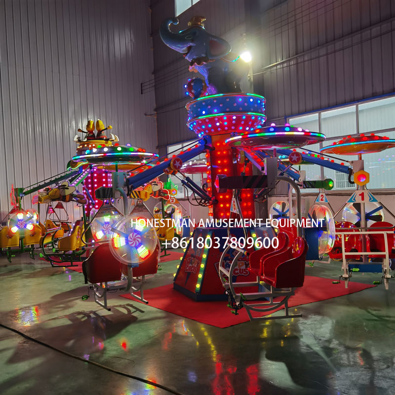 The self-controlled plane Funfair is a uniquely designed product. These include unicorns, elephants, swans, and bees. Unlike other self-controlled aircraft, this one uses pedaling to propel the cabin upward. Once ascending, a lever on top closes the air valve to descend. This aircraft utilizes a pneumatic mechanism: a rotating motor drives the gears that rotate the entire device, while an air compressor raises and lowers the hydraulic arm via a pressure valve. This makes it ideal for parent-child interaction and provides added fun.