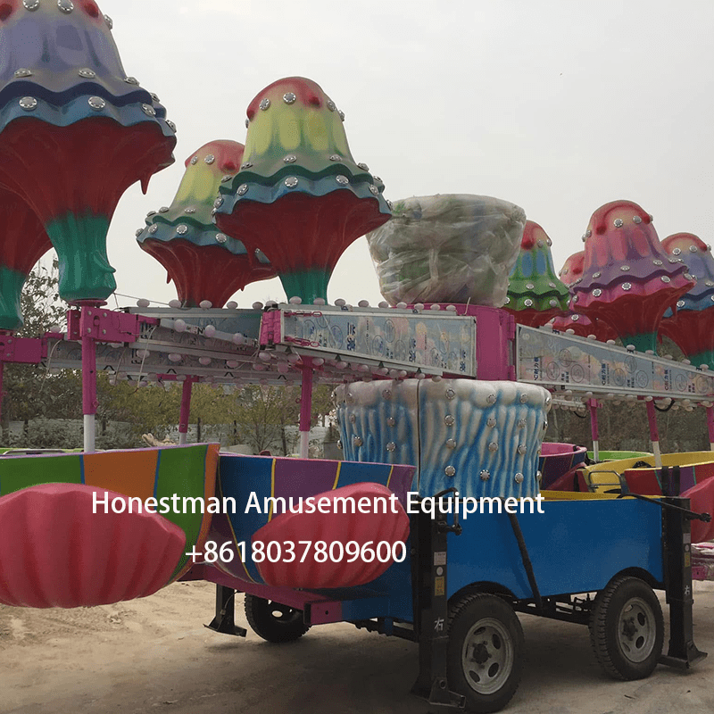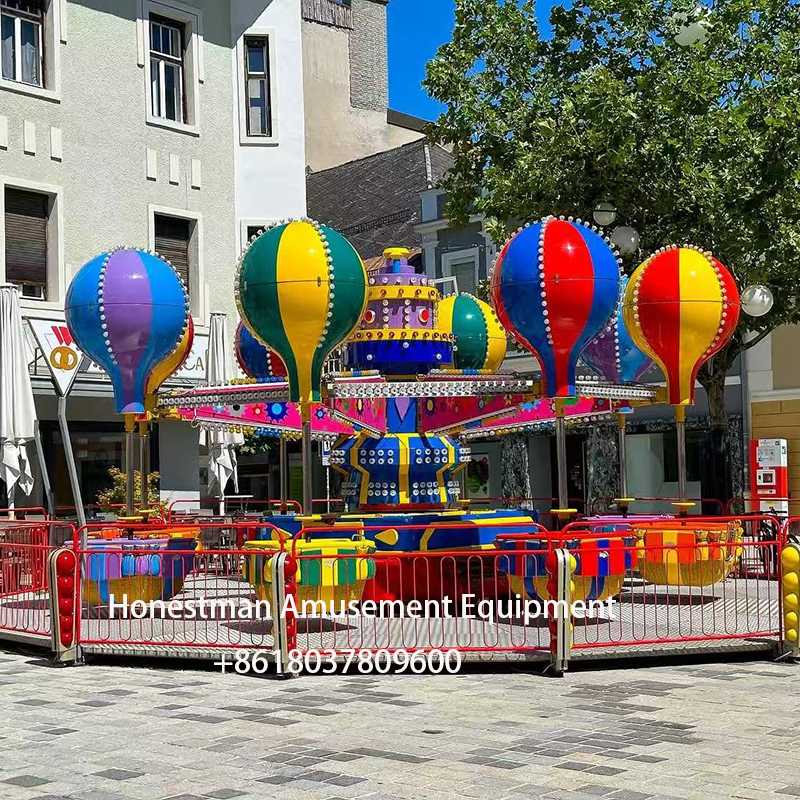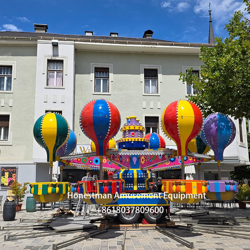 This is a self-control Samba Balloon, a hot air balloon themed device that can rotate and sway. It has 8 cabins and can accommodate 16-24 passengers. A trailer can be customized for easy movement.