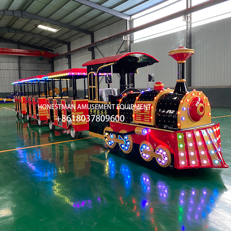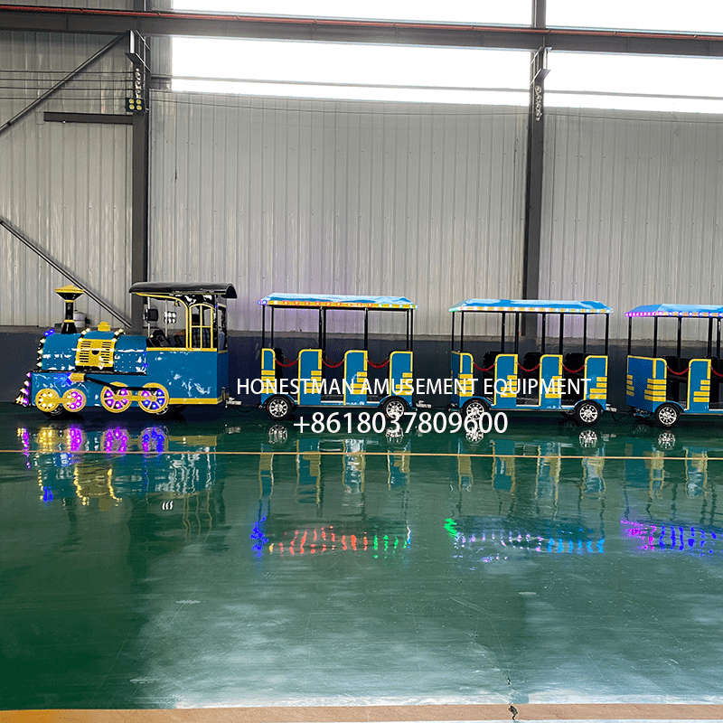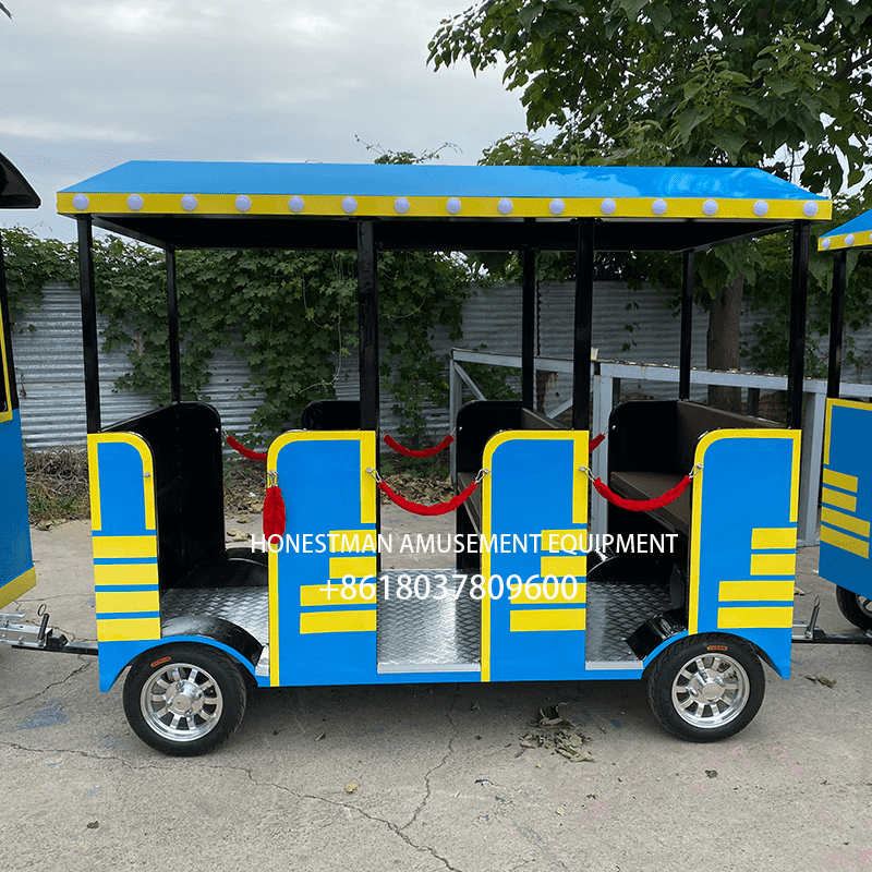 This tourist train features customizable sheet metal carriages and fiberglass fronts. Each carriage seats six, for a total of 18 passengers across three carriages. Three entrances allow for convenient boarding and alighting, and the trains are more spacious than enclosed carriages. While the trains typically feature red and blue, custom colors, logos, and text are also available. Ideal for scenic spots, parks, resorts, and farms.