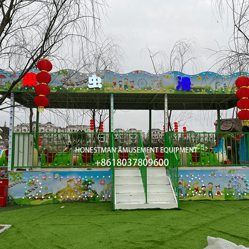 This dinosaur train ride amusement is green-themed, with an undulating track, six carriages, and a capacity of 12 passengers. There’s a tree and deer decoration in the center, and the platforms are quite brightly lit.