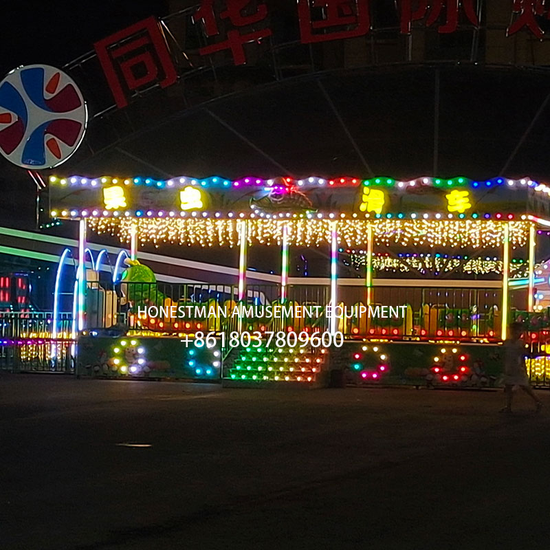 This dinosaur train ride amusement has beautiful appearance and beautiful lighting.